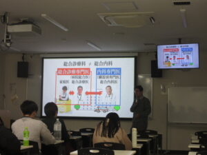 南郷先生からは、エビデンスに基づく治療の重要性やキャリアパスについて、実例や図を交えながら分かりやすくご説明いただきました。学生が将来を考えるうえで、とても参考になるお話でした。ご専門の先生が、総合診療医や家庭医についてまとめてお話いただける機会は少なく、貴重で有意義な公演会となりました。